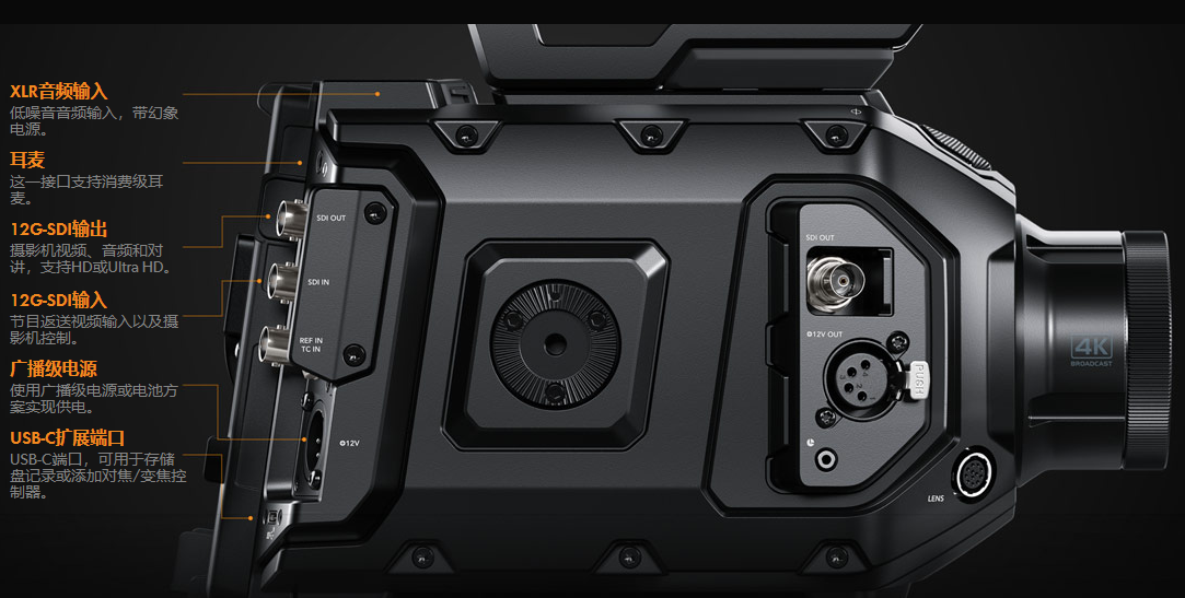 Blackmagic URSA Broadcast G2搭载包括12G-SDI在内的新型技术和接口。其中,12G-SDI接口可用于视频输出和节目返送信号输入。多速率12G-SDI接口可在所有HD和Ultra HD格式之间切换,最高可达2160p60。其他包括耳机接口、USB-C接口、带幻象电源的平衡XLR音频接口,以及时间码/同步输入接口。摄影机前方搭载一个12针Hirose接口,可用于广播级镜头控制,还可以为镜头提供电源。如果要连接寻像器或现场监看设备,还可以使用摄影机的HD-SDI监看输出和广播级4针XLR 12V DC电源输出!