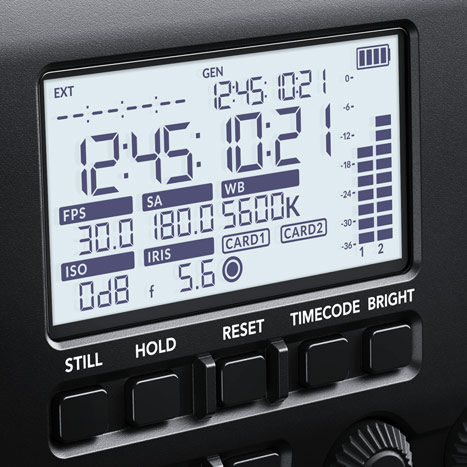摄影机设有一块清晰的LCD状态显示屏,可在明亮环境下查看到所有信息!这块状态显示屏可反馈记录时间码、锁定时间码和同步时间码,以及当前的拍摄帧率、快门角度、光圈、白平衡、增益和光圈设置,并且还设有电池电量提示、存储卡记录状态以及用来监看电平指标的音频表。在昏暗环境下拍摄时,您还可以开启屏幕背光功能;亦或者在户外明亮环境下拍摄时关闭背光功能。不论何种拍摄条件,屏幕上的各种显示信息都能清晰明了!