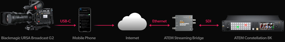 向全世界现场直播!Blackmagic URSA Broadcast G2搭载内置硬件推流引擎,支持RTMP和SRT推流协议,因此您可以在YouTube、Facebook、X和更多平台上直播!联网方面您有两个选择,一是连接USB-C转以太网适配器,二是连接至4G或5G手机使用移动数据!此外,如果您想要以无线的方式连接回演播室,可以推流到Blackmagic ATEM Streaming Bridge,这是一台H.264解码器,可将视频流转换回SDI视频。并且,ATEM Streaming Bridge可将全面摄影机控制信号、直播Tally、甚至对讲音频发送回远程摄影机!