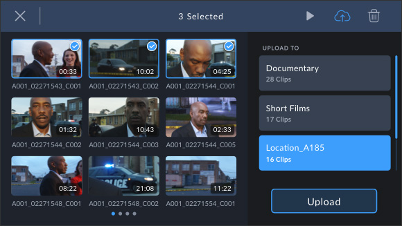 如果您处于离线状态,可以待联网后浏览媒体文件并手动选择想要上传到Blackmagic Cloud的片段。